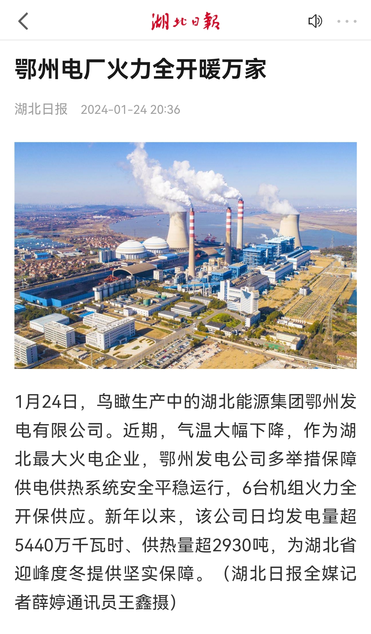 1月24日,鳥瞰生產中的湖(hu)北(bei)能源集(ji)團鄂州(zhou)發電(dian)有限(xian)公司。近期,氣(qi)溫大幅下(xia)降,作為湖(hu)北(bei)最(zui)大火電(dian)企業(ye),鄂州(zhou)發電(dian)公司多舉(ju)措保(bao)障供(gong)(gong)電(dian)供(gong)(gong)熱(re)(re)系統安(an)全(quan)平穩(wen)運(yun)行,6臺機組火力全(quan)開保(bao)供(gong)(gong)應。新年以來,該(gai)公司日均發電(dian)量超(chao)5440萬(wan)千(qian)瓦時、供(gong)(gong)熱(re)(re)量超(chao)2930噸,為湖(hu)北(bei)省迎峰(feng)度冬提供(gong)(gong)堅(jian)實保(bao)障。(湖(hu)北(bei)日報全(quan)媒記(ji)者?薛婷?通(tong)訊員?王鑫?攝)(本文載于2024年1月24日湖北日報客戶(hu)端)